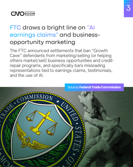 The FTC announced settlements that ban “Growth Cave” defendants from marketing/selling (or helping others market/sell) business opportunities and credit-repair programs, and specifically bars misleading representations tied to earnings claims, testimonials, and the use of AI. (FTC)